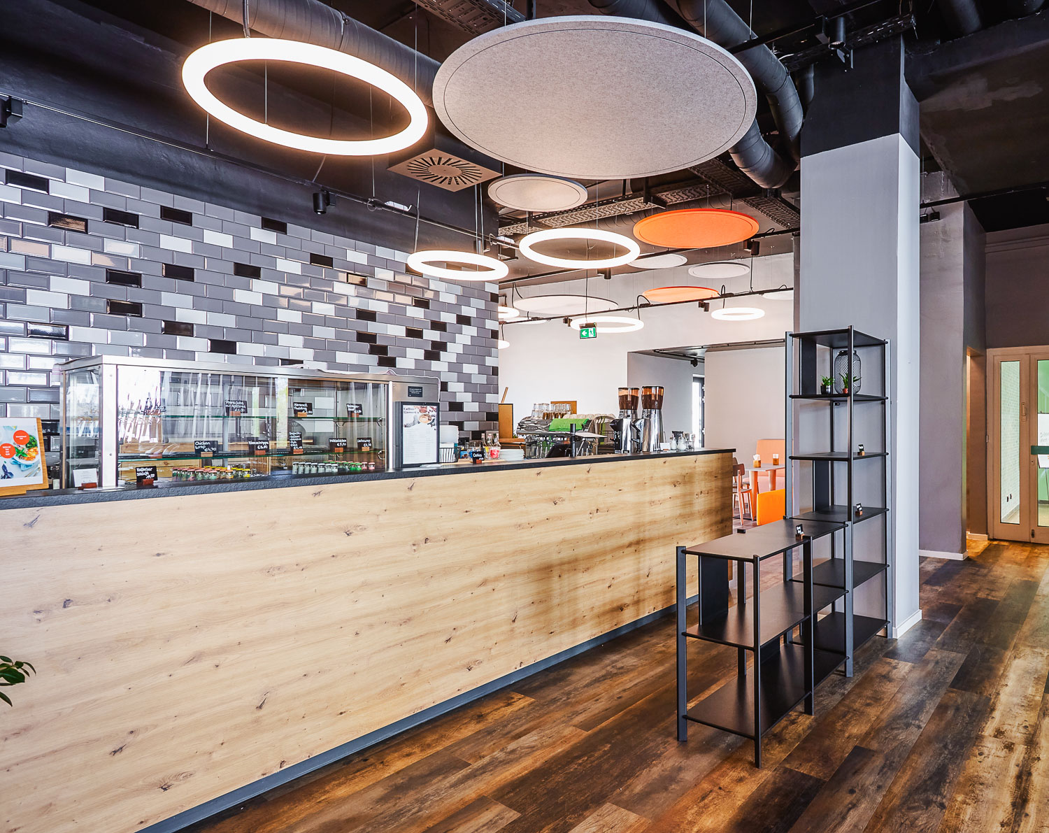 Moderne Küche mit wechselndem Angebot, Lounge-Bereich für Kaffee und Snacks sowie Remote-Working-Möglichkeiten.