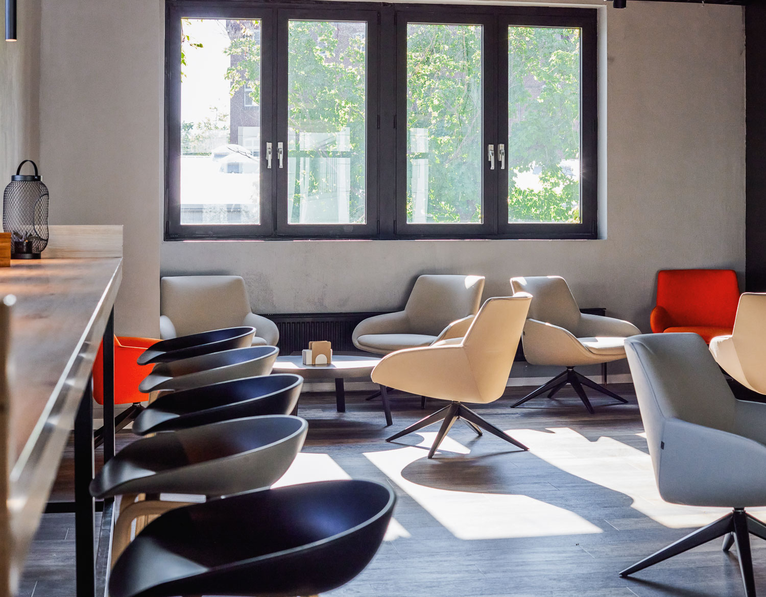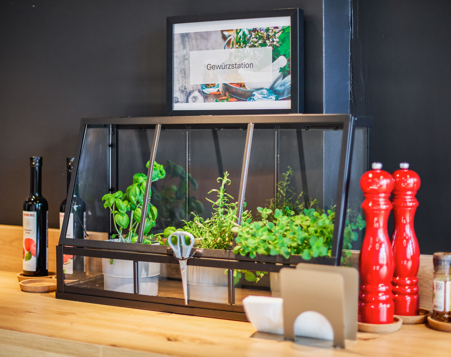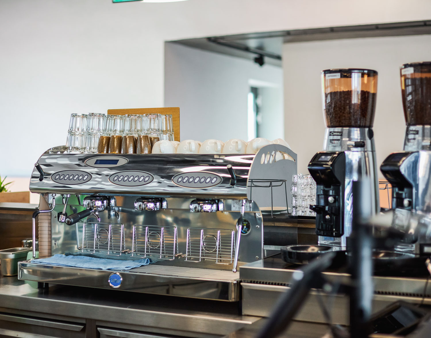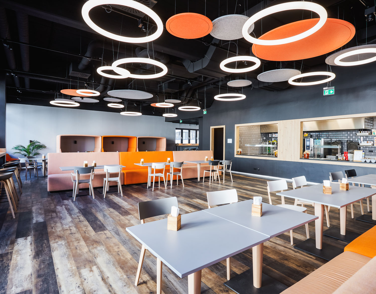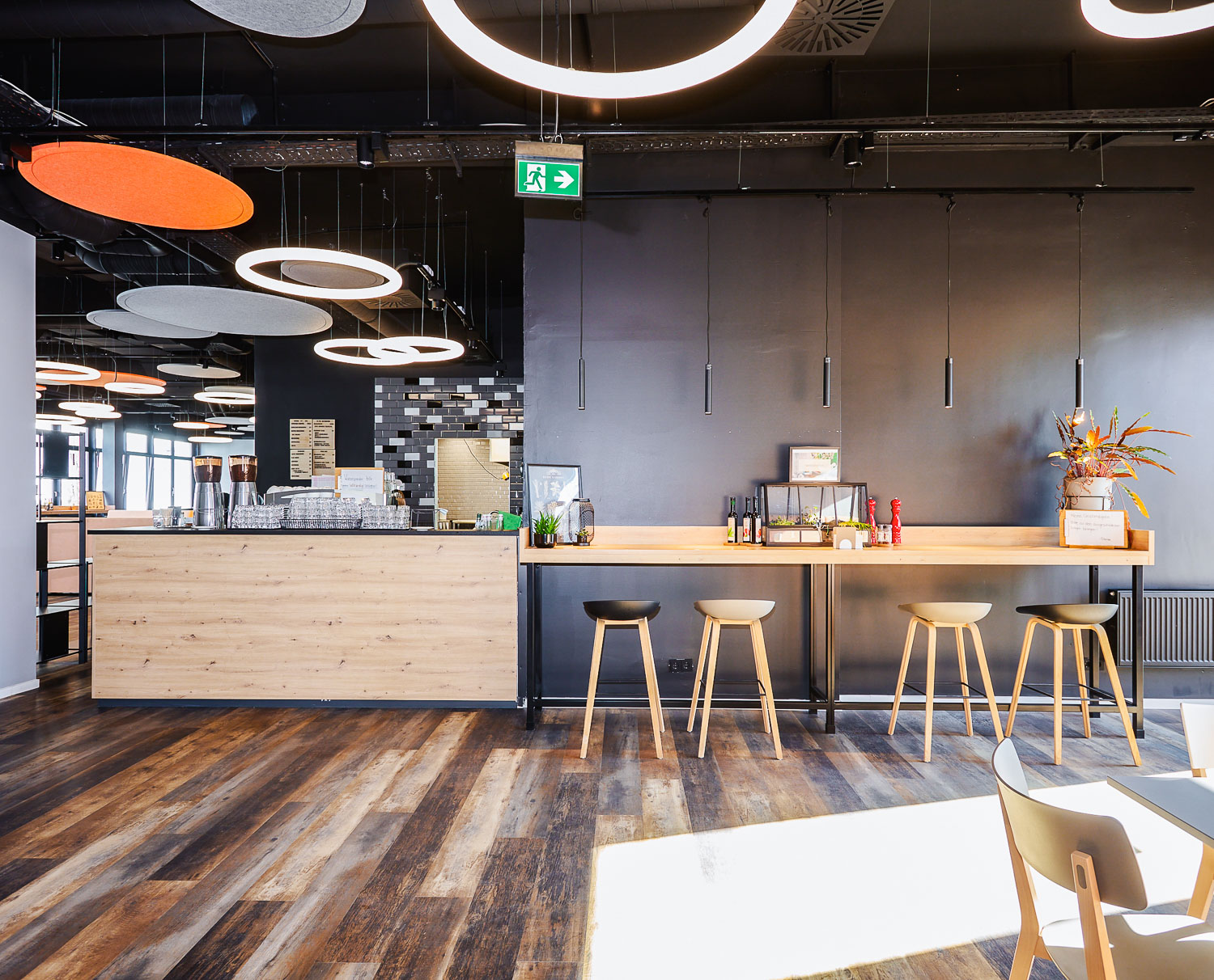 Moderne Küche mit wechselndem Angebot, Lounge-Bereich für Kaffee und Snacks sowie Remote-Working-Möglichkeiten.